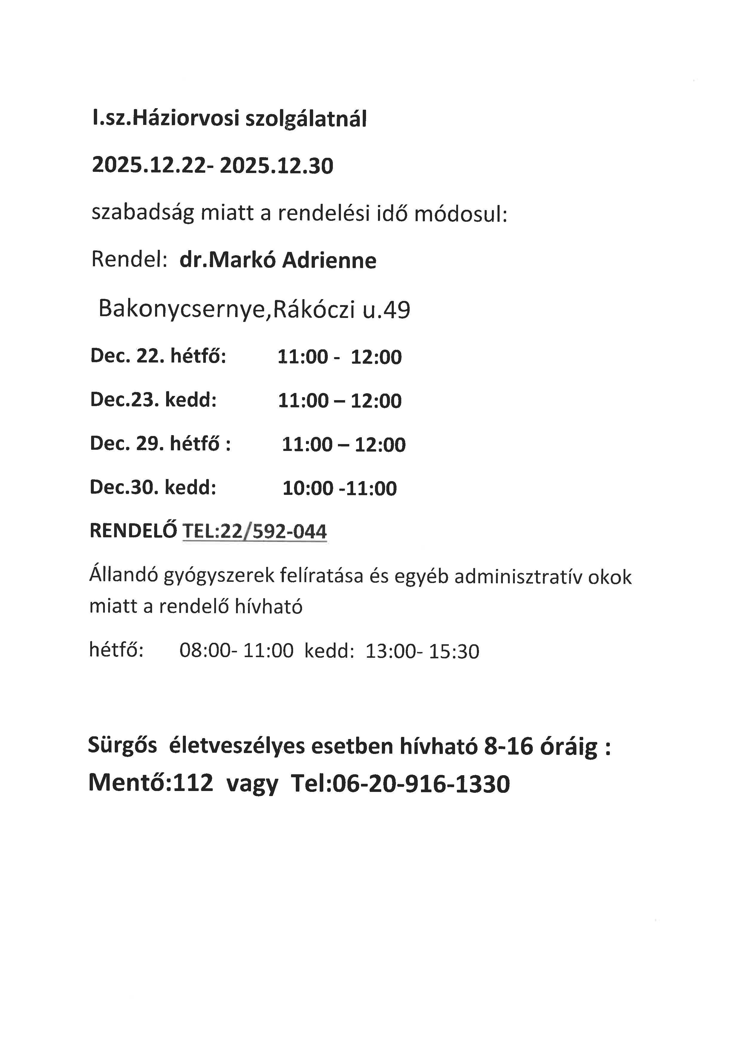 I. sz. Háziorvosi szolgálatnál 2025.12.22 - 2025.12.30 szabadság miatt a rendelési idő módosul.