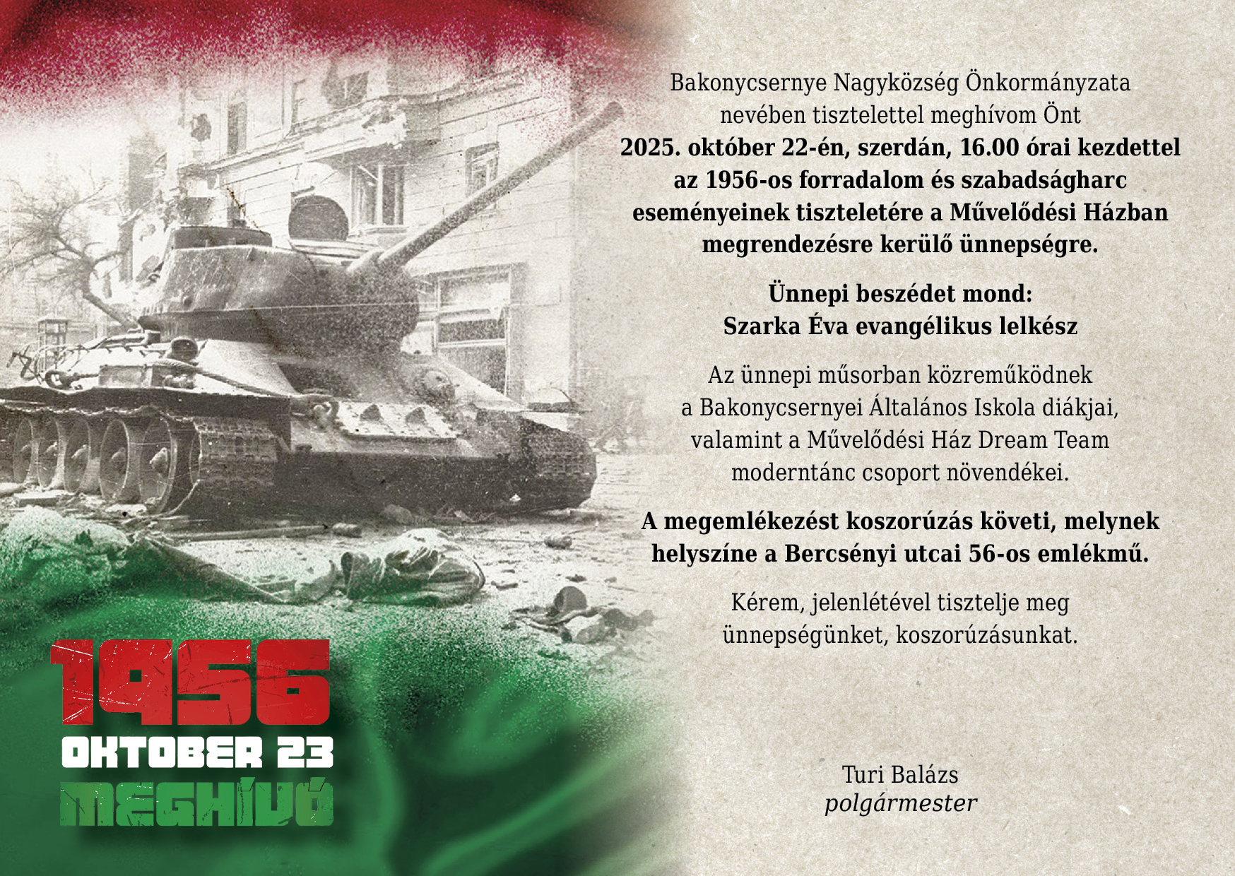 Meghívó az 1956-os forradalom és szabadságharc eseményeinek tiszteletére megrendezésre kerülő ünnepségre.